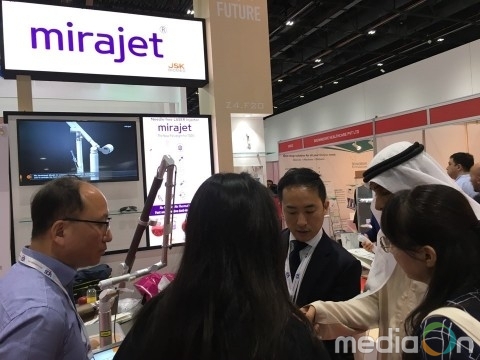 특히 국내 의료기기 벤처기업 JSK바이오메드㈜는 세계최초 레이저 펄스 압력방식의 바늘 없는 주사시스템을 중동시장에 처음으로 선보이며 의료관계자들과 바이어들의 높은 관심을 받으며 주목을 이끌었다. 레이저 펄스로 강력한 에너지를 만들어 약물을 젯 형태로 순간적으로 분사하여 피부에 매우 소량의 약물을 일정하고 빠르게 침투시키는 방식인 미라젯은 주로 피부미용을 위한 목적으로 사용된다.